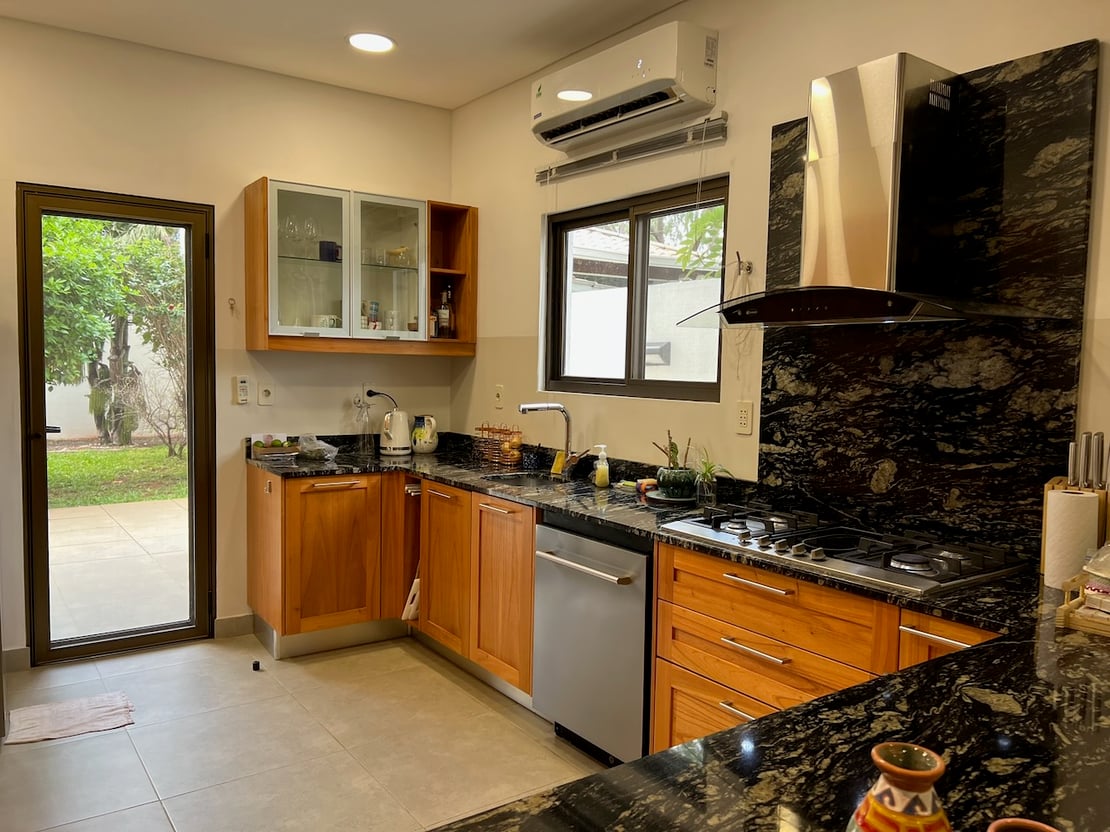 Ausgestattet ist die Küche mit Gas-Kochfeld und großer Dunstabzugshaube; außerdem sind praktische Einbauten und Stauraumlösungen vorhanden, inklusive Backofen, Platz für einen großen Kühlschrank sowie Geschirrspüler. Ein Fenster sorgt für Tageslicht und gute Belüftung, zusätzlich ist in der Küche eine Klimaanlage installiert – ein spürbares Komfort-Plus im Alltag. Besonders praktisch ist der direkte Ausgang in den Außenbereich: ideal, um Einkäufe schnell ins Haus zu bringen oder den Patio/Grillbereich unkompliziert zu nutzen.