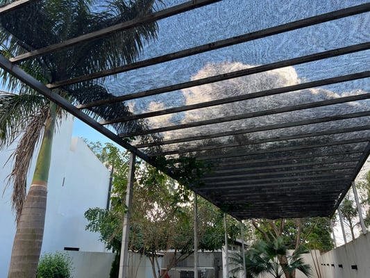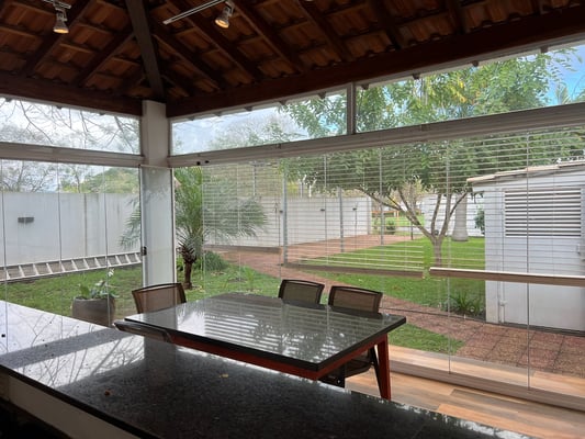 Große, lichtdurchlässige Elemente schaffen ein offenes, angenehmes Raumgefühl und ermöglichen zugleich eine geschützte Nutzung bei Wind oder Wetter. Der Bereich ist über einen eigenen Zugang erreichbar und bietet damit ein Plus an Privatsphäre und Flexibilität – perfekt für Asado-Abende, Familienfeiern oder entspannte Stunden im Grünen.