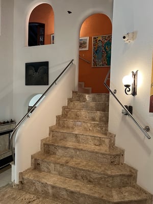 Ein harmonisches Detail: Von der Balustrade im ersten Stockwerk hat man einen beeindruckenden Blick auf das Wohnzimmer, was dem Raum zusätzliche Großzügigkeit verleiht.