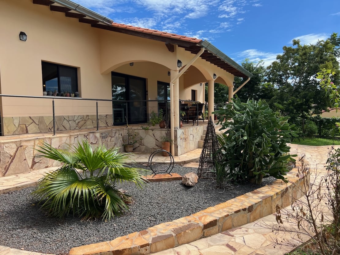 Das separate Gästehaus verfügt über zwei Schlafzimmer mit Größen von jeweils ca. 10 m². Die Wohnfläche beträgt ca. 65 m², die überdachte Fläche ca. 75 m². Das Badezimmer ist modern ausgestattet mit stilvollen Fliesen und praktischer Dusche. Der Essbereich bietet Platz für mehrere Personen. Das Wohnzimmer mit offener Küche ist gemütlich gestaltet und verfügt über eine kleine Küchenzeile. Die überdachte Fläche von ca. 15 m² ist ideal für Mahlzeiten im Freien. Das Gästehaus zeichnet sich durch Natursteinakzente und eine überdachte Veranda mit Rundbögen aus und bietet durch seinen eigenständigen Zugang Privatsphäre für Gäste. Das gesamte Gelände um das Gästehaus ist umzäunt.