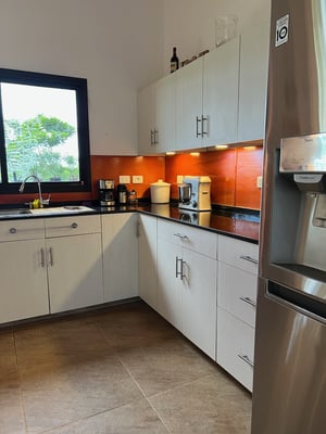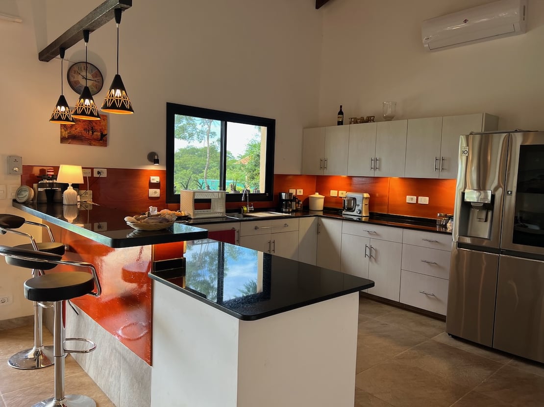 Die Küche ist modern ausgestattet mit Granit-Arbeitsplatten, einem praktischen Tresen und ausreichend Stauraum. Der angrenzende Essbereich bietet Platz für einen großen Esstisch und ermöglicht direkten Zugang zur Terrasse für Mahlzeiten im Freien. Der hochwertige Kühlschrank kann optional erworben werden.