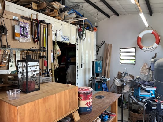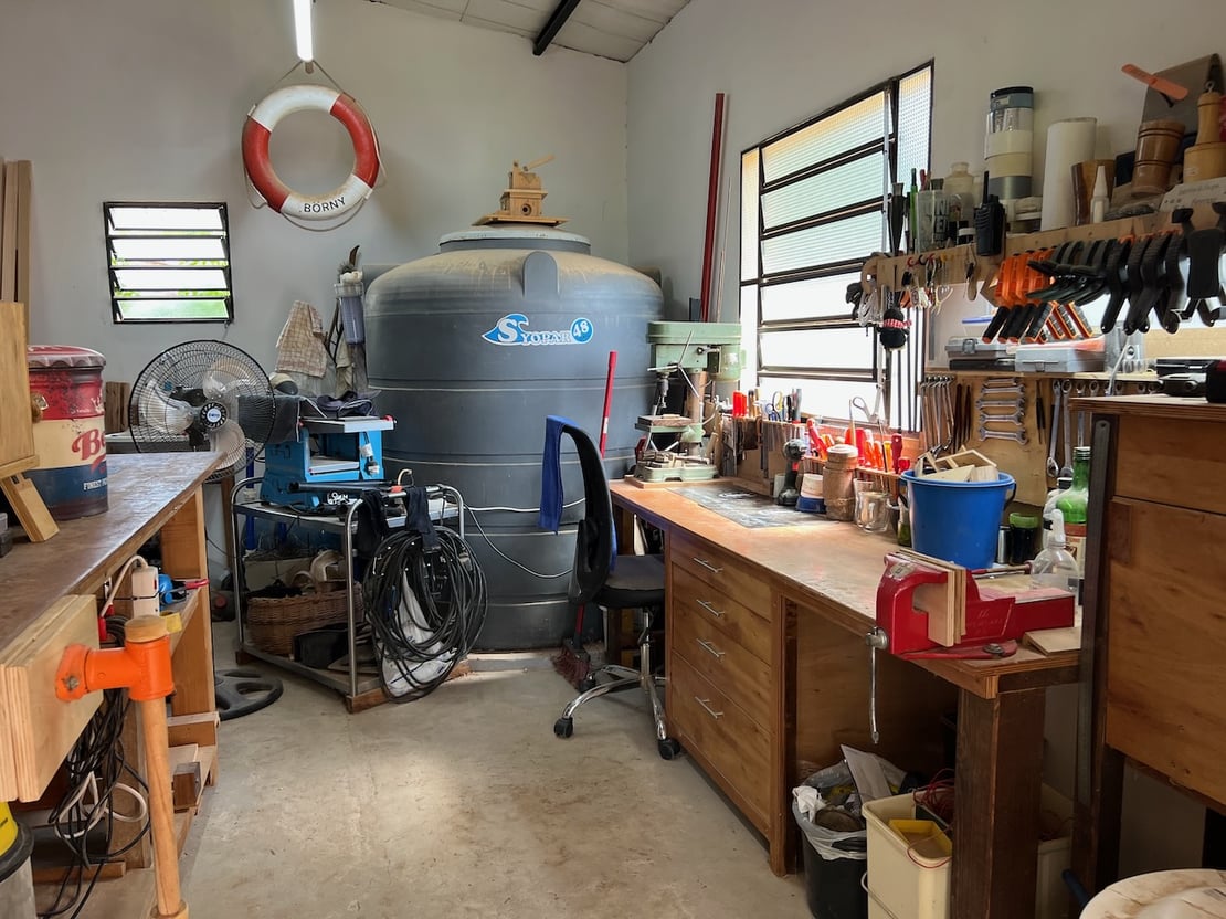 Eine separate, geräumige Werkstatt bietet viel Platz für Werkzeuge und Hobbyarbeiten sowie einen großen Wassertank zur Sicherstellung der Wasserversorgung. Zusätzlich gibt es Platz für Motorräder oder als Abstellraum. Die Werkstatt besteht aus einem umgebauten 20-Fuß-Container sowie einem zusätzlichen Raum von ca. 20 m² und einem ca. 20 m² großen überdachten Außenbereich mit Rampe. Die Werkstatt ist mit einem Notstromaggregat (kann optional erworben werden), einem 2.000-Liter-Wassertank und einer Hauswasseranlage ausgestattet. Der eigene Tiefenbrunnen mit einer Tiefe von 120 Metern sichert die Wasserversorgung. Zusätzlich gibt es eine Wasserumschaltfunktion bei Stromausfall.