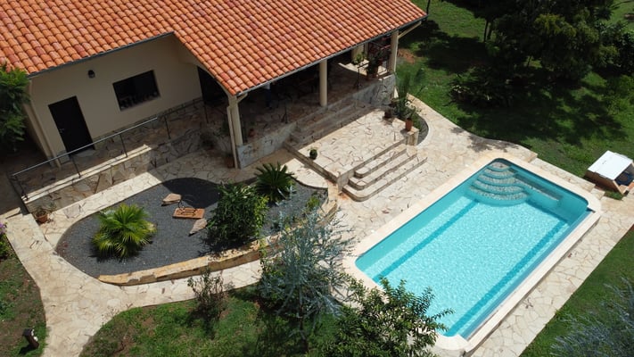 Der großzügige, rechteckige Pool verfügt über eine Salzwasseranlage und ist von einer Natursteinfläche umgeben, die Platz für Sonnenliegen und Sitzmöglichkeiten bietet. Eine Außendusche ist ebenfalls vorhanden. Die Lage des Pools gewährleistet Privatsphäre und einen schönen Blick ins Grüne.