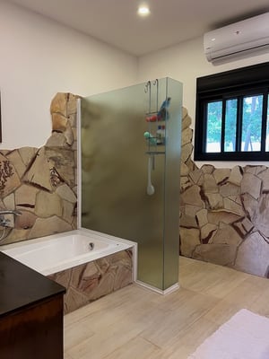 - Hauptbadezimmer: Naturstein, große Badewanne