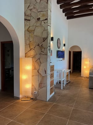 Ein überdachter Stellplatz für Fahrzeuge befindet sich direkt neben dem Haus und bietet Komfort beim Ein- und Aussteigen. Zusätzlich verfügt das Haupthaus über einen praktischen Waschraum für Waschmaschine und einen Abstellraum. Die Bodenbeläge bestehen aus hochwertigen, großformatigen Fliesen in warmen Erdtönen. Technisch ist das Haus mit Netzwerkverkabelung in allen Räumen ausgestattet und bietet Klimaanlagen für angenehme Temperaturen. Glasfaser-Internet ist in beiden Häusern verfügbar. Ein Notstromaggregat sorgt für Stromversorgung im Notfall (kann optional erworben werden).