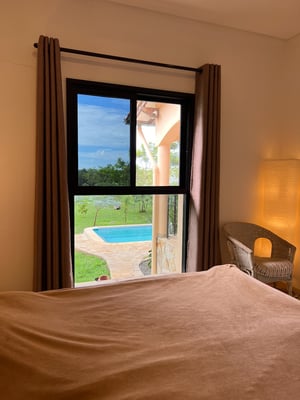 Es gibt zwei Schlafzimmer im Haupthaus. Das Hauptschlafzimmer ist geräumig und hell, mit Doppelverglasung und Blick in den Garten und auf den Pool. Zum Teil sind die Wände doppelt ausgeführt und die Fenster zweifach verglast, was für zusätzliche Wärme- und Schallisolierung sorgt. Ein eigenes Ankleidezimmer schafft Ordnung. Das zweite Schlafzimmer ist ideal als Gästezimmer oder Büro nutzbar.