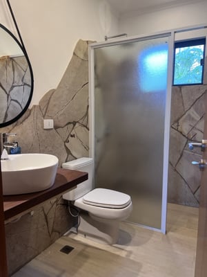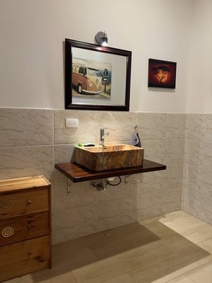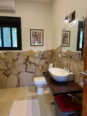 Das Hauptbadezimmer ist stilvoll mit Natursteinverkleidung ausgestattet und verfügt über eine große Badewanne. Zudem gibt es ein modernes Gäste-WC mit hochwertigen Fliesen in Natursteinoptik. Zusätzlich gibt es ein Außen-WC.