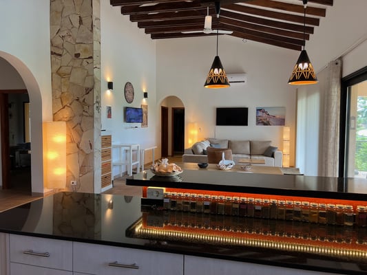 Sowohl innen als auch außen verleihen Naturstein-Akzente dem Haus einen rustikalen und zugleich eleganten Charakter. Indirekte Beleuchtung sorgt für eine angenehme Atmosphäre in den Wohnbereichen. Hochwertige Materialien wie Holzdecken, Granit-Arbeitsplatten und stilvolle Lampen unterstreichen die Qualität der Ausstattung.