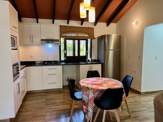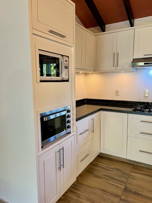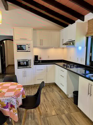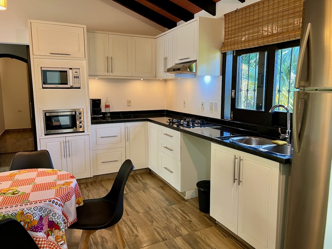 Die Küche des Hauses ist ein echtes Highlight: modern, hell und funktional gestaltet. Sie ist mit allem ausgestattet, was man zum Kochen und Wohlfühlen braucht – darunter ein Gasherd mit Dunstabzugshaube, ein großer Kühlschrank in Edelstahloptik, Mikrowelle, Toaster-Ofen und Kaffeemaschine. Hochwertige Einbauschränke bieten viel Stauraum für Küchenutensilien und Vorräte.