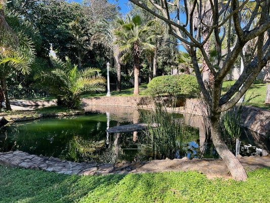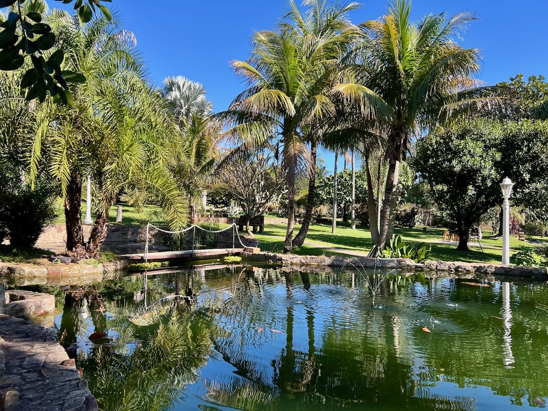 Ein zentrales Highlight der Anlage ist die dekorative Lagune mit Brücke, umgeben von gepflegtem Rasen, Palmen und Ruhezonen. Die Wege führen durch verschiedene grüne Bereiche und bieten immer wieder wunderschöne Blickachsen ins natürliche Grün. Die Atmosphäre ist ruhig, friedlich und sehr privat. Bewohner des Mietobjekts genießen den exklusiven Zugang zu diesem grünen Refugium. Nach Absprache kann auch der Pool am Haupthaus mitgenutzt werden. Ein fester Ansprechpartner ist direkt vor Ort und kümmert sich bei Bedarf um Anliegen rund ums Haus oder Grundstück.