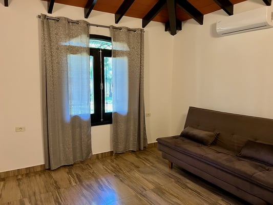 Direkt angrenzend befindet sich ein weiterer Raum, in dem aktuell eine Schlafcouch steht – ideal nutzbar als Gästezimmer, Ruheraum oder Rückzugsort zum Lesen oder Arbeiten. Durch ein großes Fenster mit Blick ins Grüne kommt viel Tageslicht in beide Räume. Das zugehörige Badezimmer ist modern ausgestattet mit Dusche, Waschbecken und WC.