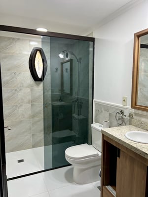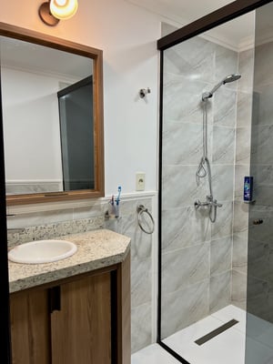 Das En-Suite-Badezimmer ist stilvoll und modern gestaltet – mit einer großzügigen Dusche, Waschbecken und WC. Die harmonische Farbgestaltung sowie die hochwertige Ausstattung sorgen für ein angenehmes Wohngefühl.