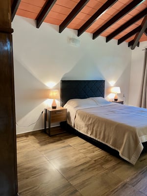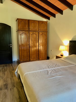 Das zweite Schlafzimmer bietet durch seinen direkten Zugang zum angeschlossenen Badezimmer höchsten Komfort. Der Raum ist ebenfalls mit einem gemütlichen Doppelbett, zwei Nachttischen mit Lampen und einem großen Kleiderschrank aus Massivholz ausgestattet.