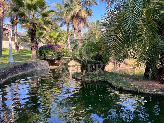 Im Herzen der Anlage liegt ein idyllischer Teich, ein ruhiges Wasserjuwel, das das Auge anzieht und die Seele beruhigt. Umgeben von einer Vielfalt exotischer Pflanzen, die im eigenen "Vivero" gezüchtet werden, bietet die Anlage eine perfekte Symbiose aus natürlicher Schönheit und menschlicher Kreativität.